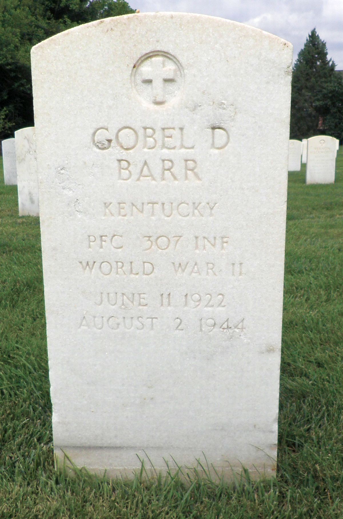 Gobel D. Barr was born on June 11, 1922. He was the son of Willard Barr and Mary Loral White Woodward. He served in the 307th Infantry Regiment, 77th Division, as a Private First Class during World War II. He died on August 2, 1944, during the Battle for Guam.