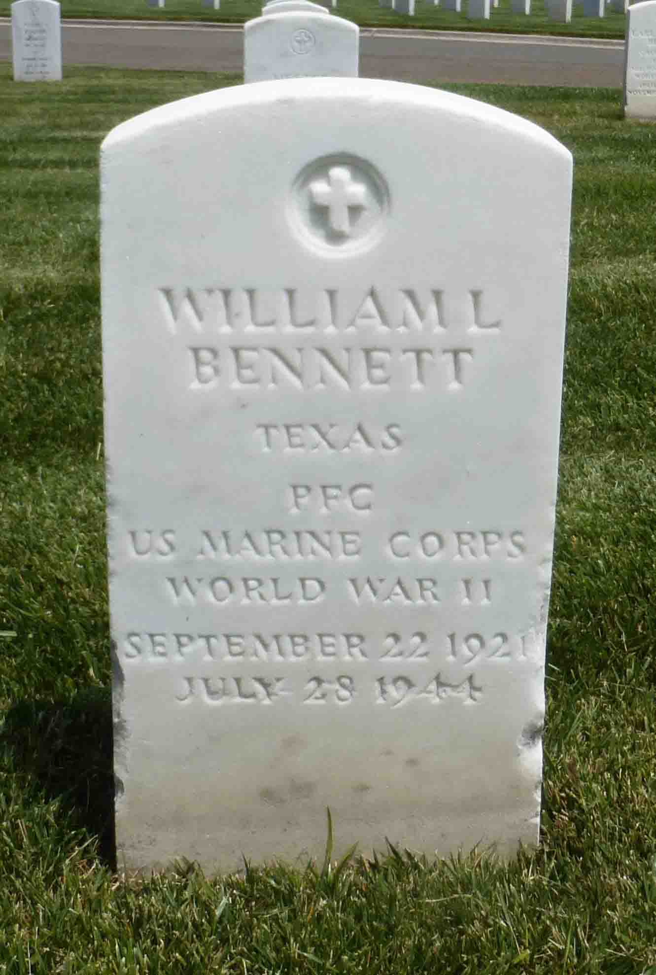 William Lee Bennett was born on September 22, 1921. He served in Company E, 2nd Battalion, 4th Marine Regiment, 1st Provisional Marine Brigade, as a Private First Class during World War II. He was Killed in Action on July 28, 1944, during the Battle for Guam.