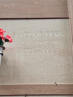 Elgie Berg as born on 1915. He was the son of Othmer John Berg and Annie Elizabeth Tate Berg. He served in Company A, 1st Battalion, 9th Marine Regiment, 3rd Marine Division, as a Sergeant during World War II. He was Killed in Action on July 21, 1944, during the Battle for Guam.