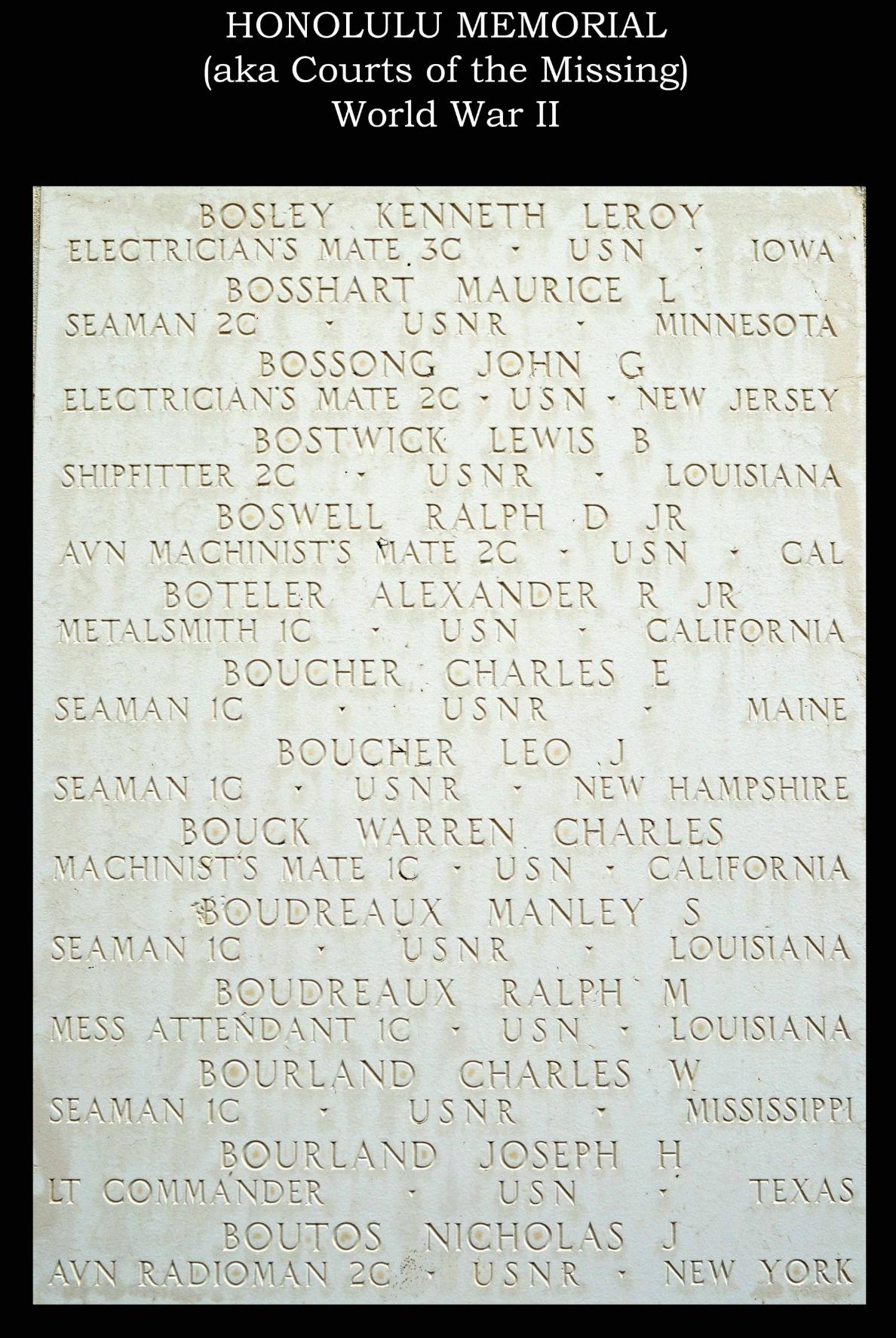 Nicholas J. Boutos served in the United States Naval Reserve as an Aviation Radioman Second Class during World War II. He was Killed in Action on July 16, 1944, during the Battle for Guam.