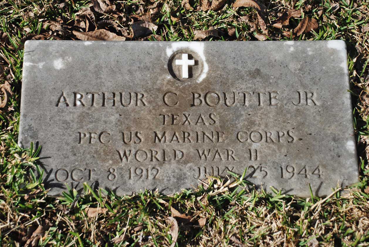 Arthur Charles Boutte Jr. was born on October 8, 1912. He served in Company A, 2nd Separate Engineer Battalion, United States Marine Corps as a Private First Class during World War II. He was Killed in Action on July 25, 1944, during the Battle for Guam.