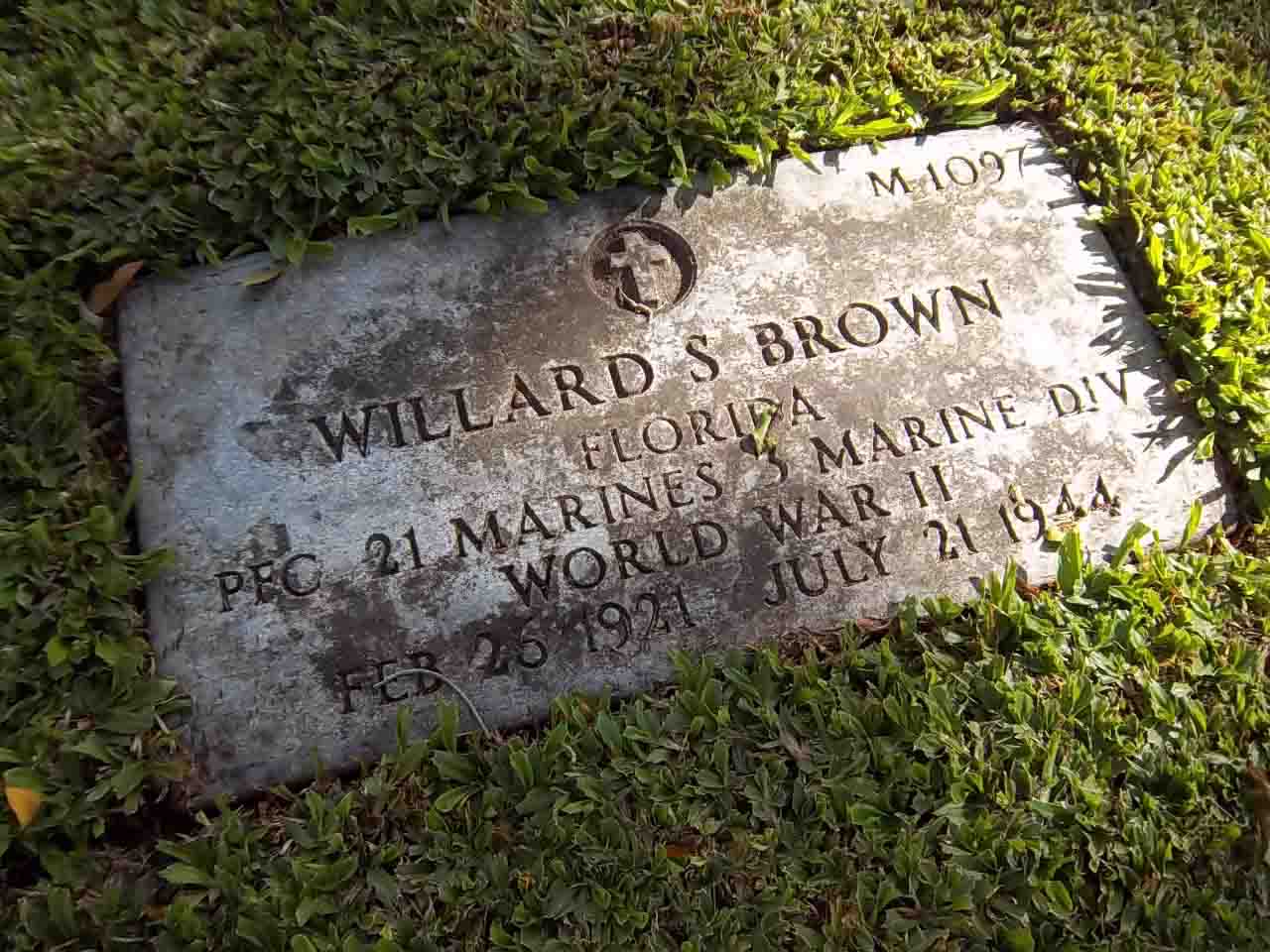 Willard Stephen Brown was born on February 26, 1921. He served in Company C, 1st Battalion, 21st Marine Regiment, 3rd Marine Division as a Private First Class during World War II. He died from his wounds received in battle on July 21, 1944, during the Battle for Guam.