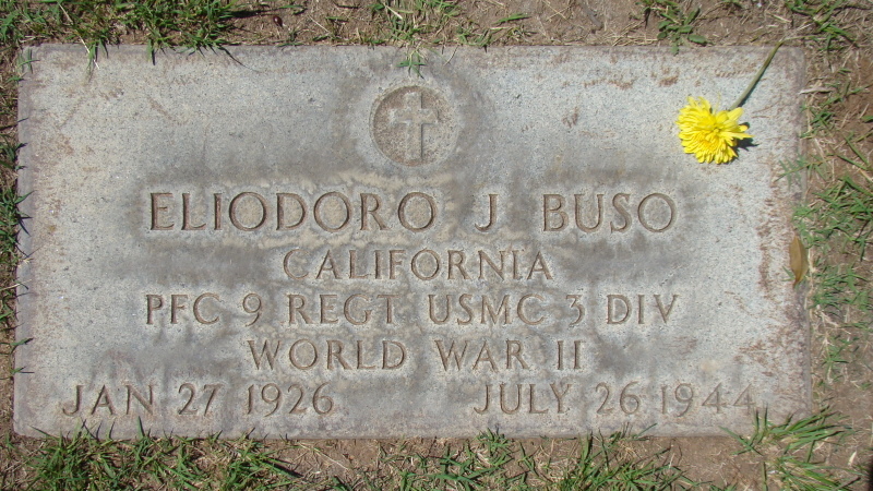 Eliodoro Juan Buso was born on January 27, 1926. He was the son of Jesus Buso. He served in Company F, 2nd Battalion, 9th Marine Regiment, 3rd Marine Division as a Private First Class during World War II. He was Killed in Action on July 26, 1944, during the Battle for Guam.