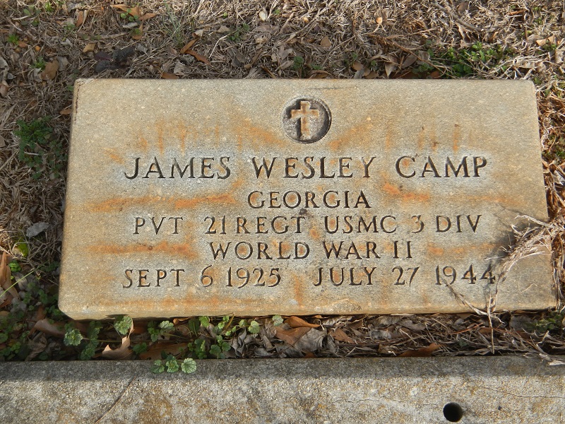 James Wesley Camp was born on September 6, 1925, in Georgia. He was the son of Charles B. Camp. He served in Company L, 3rd Battalion, 21st Marine Regiment, 3rd Marine Division as a Private during World War II. He was Killed in Action on July 27, 1944, during the Battle for Guam.