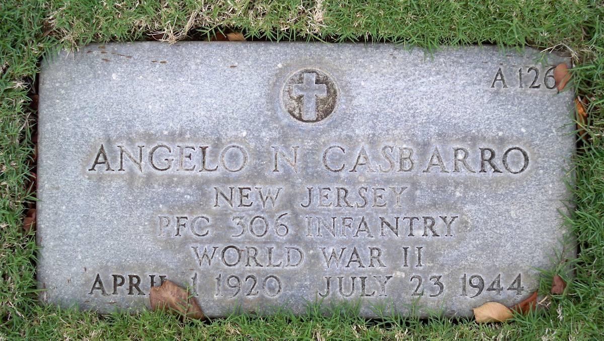 Angelo N. Casbarro was born on April 1, 1920, in Paterson, Passaic County, New Jersey. he served in the 306th Infantry Regiment, 77th Infantry Division as a Private First Class during World War II. He was Killed in Action July 23, 1944, during the Battle for Guam.