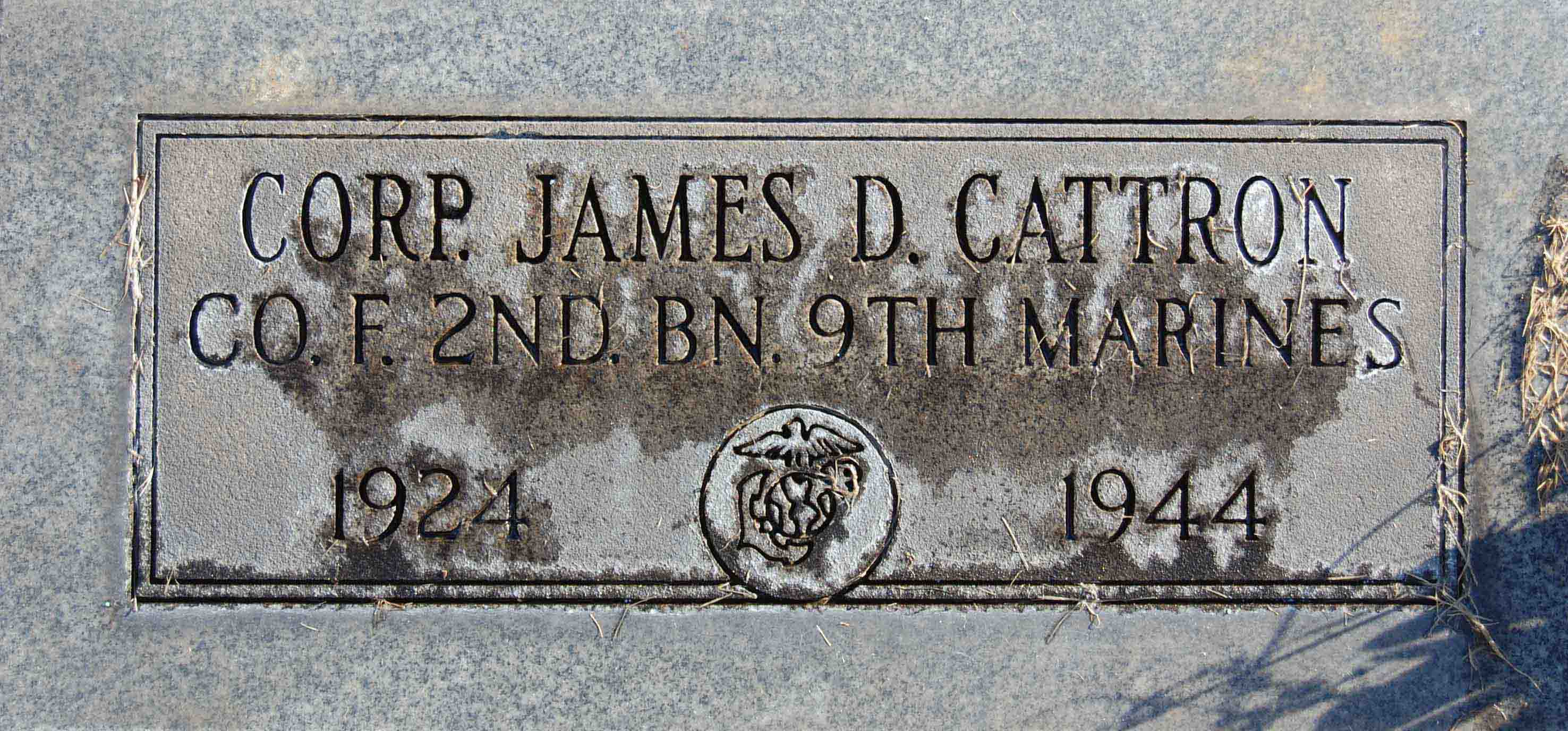 James Delbert Cattron was born on May 1, 1924. He was the son of Delbert Maurice Cattron. He served in Company F, 2nd Battalion, 9th Marine Regiment, 3rd Marine Division as a Corporal during World War II. He was Killed in Action on July 25, 1944, during the Battle for Guam.