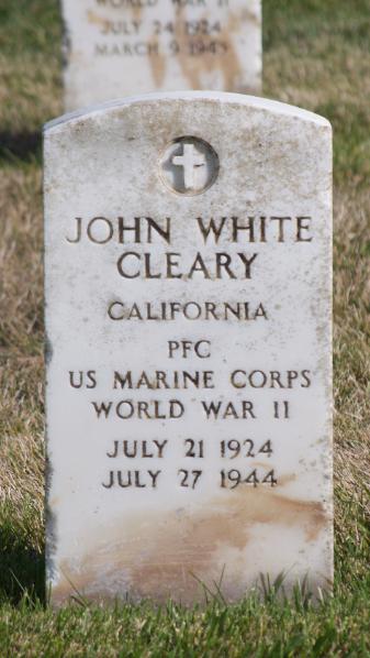 John White Cleary was born on July 21, 1924. He served in the Headquarters and Service Company, 21st Marine Regiment, 3rd Marine Division as a Private First Class during World War II. He was Killed in Action on July 27, 1944, during the Battle for Guam.