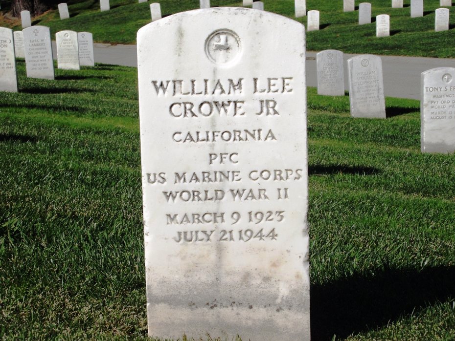William Lee Crowe Jr. was born on March 9, 1923. He served in Company F, 2nd Battalion, 21st Marine Regiment, 3rd Marine Division as a Private First Class during World War II. He was Killed in Action on July 21, 1944, during the Battle for Guam.