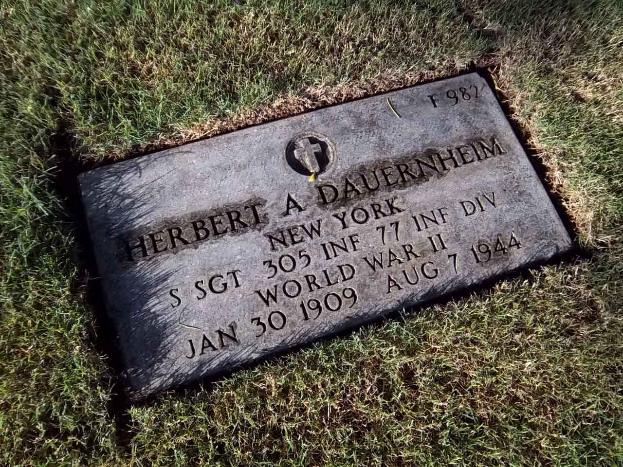 Herbert A. Dauernheim was born on January 30, 1909. He served in the 305th Infantry Regiment, 77th Division as a Staff Sergeant during World War II. He was Killed in Action on August 7, 1944, during the Battle for Guam.