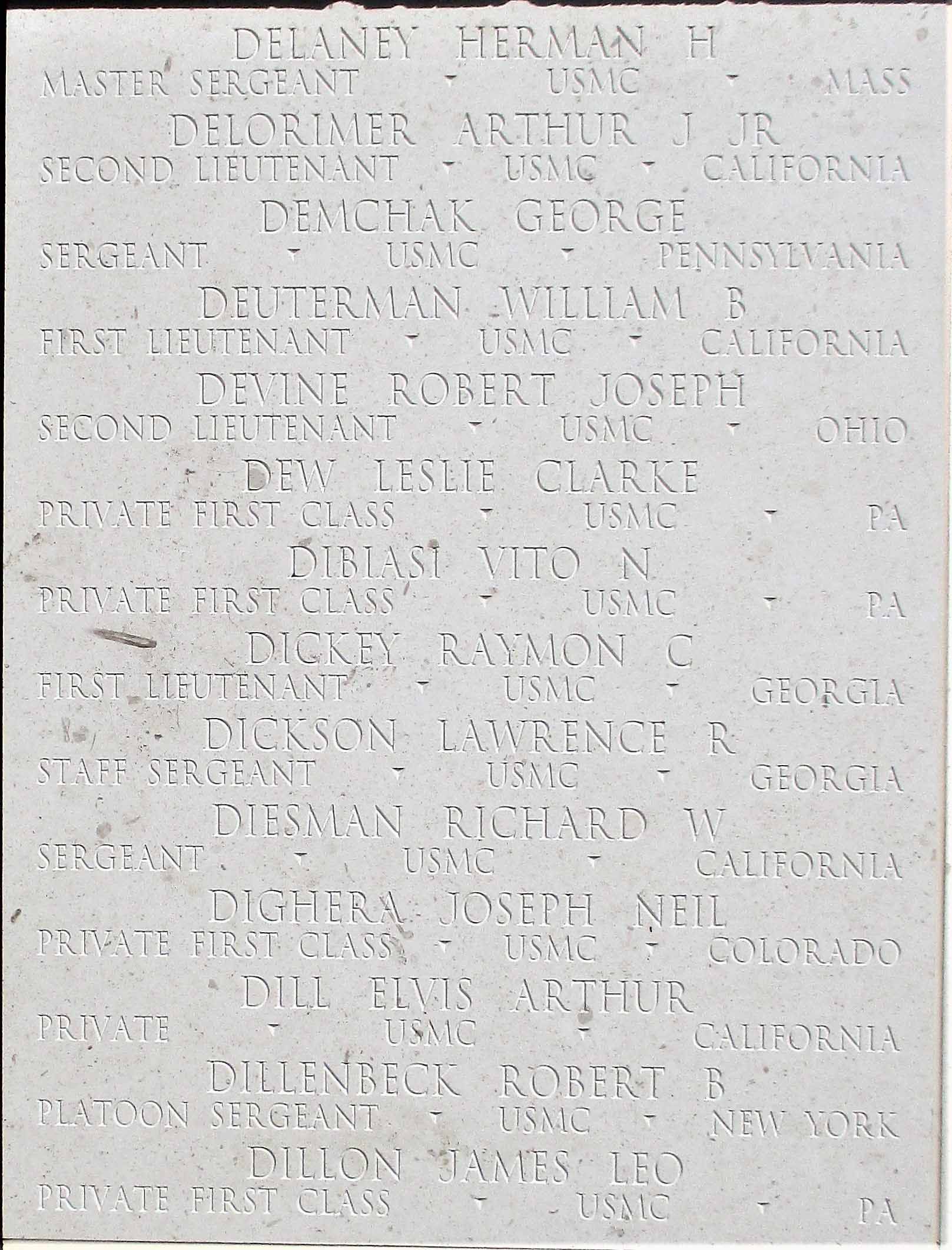 He served in the Headquarters Company, 1st Battalion, 22nd Marine Regiment, 1st Provisional Marine Brigade as a Private First Class during World War II. He was Killed in Action on July 21, 1944, during the Battle for Guam.