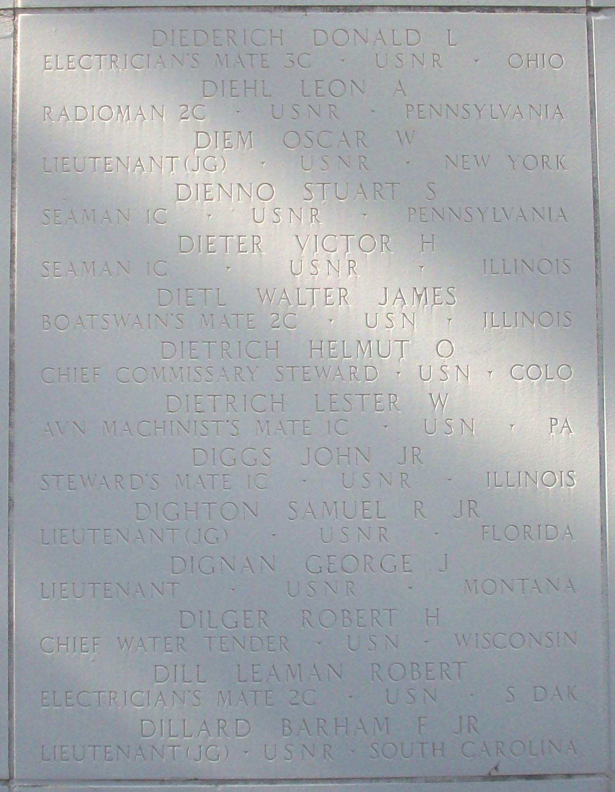 Oscar Werner Diem served in the United States Navy as a Lieutenant Junior Grade during World War II. He was declared Missing in Action on July 17, 1944, during the Battle for Guam, and then later declared dead on February 2, 1946.
