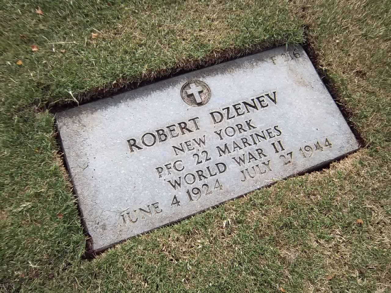 Robert Dzenev was born on June 4, 1924. He served in Company K, 3rd Battalion, 22nd Marine Regiment, 1st Provisional Marine Brigade as a Private First Class during World War II. He was Killed in Action on July 27, 1944, during the Battle for Guam.