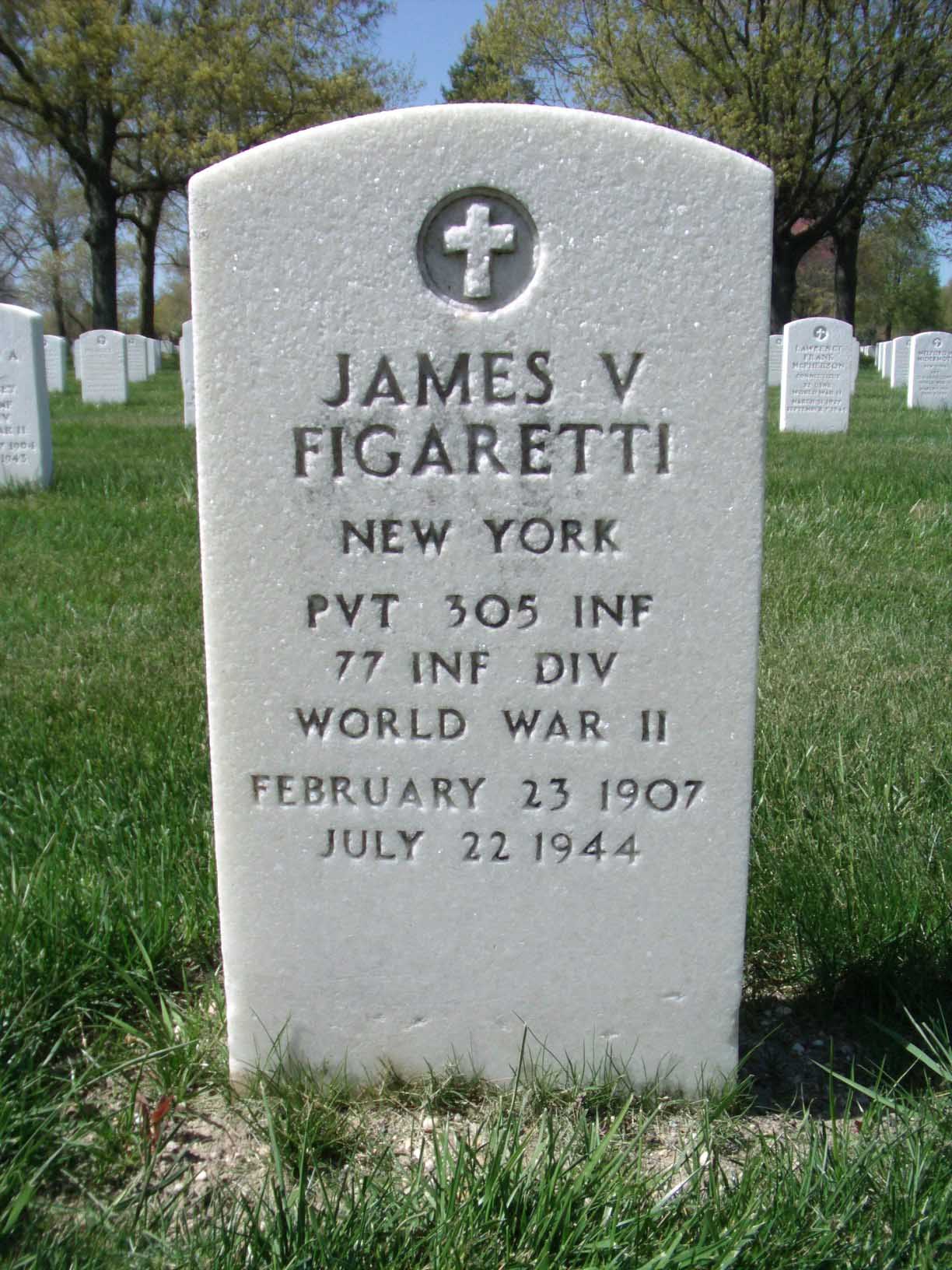 James V. Figaretti was born on February 23, 1907. He served in the 305th Infantry Regiment, 77th Division as a Private during World War II. He died on July 22, 1944, during the Battle for Guam.