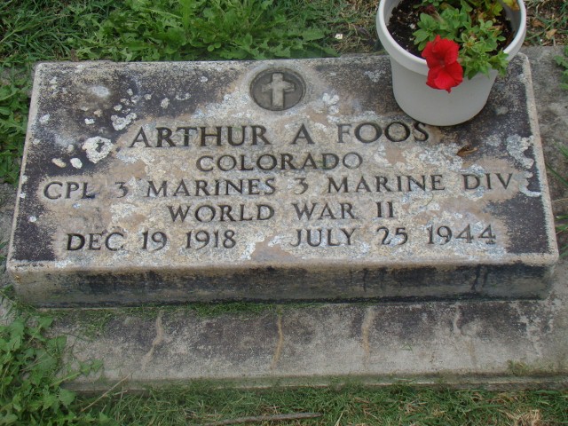 Arthur A. Foos was born on December 19, 1918. He served in Company A, 1st Battalion, 3rd Marine Regiment, 3rd Marine Division as a Corporal during World War II. He died from his wounds received in battle on July 25, 1944, during the Battle for Guam.