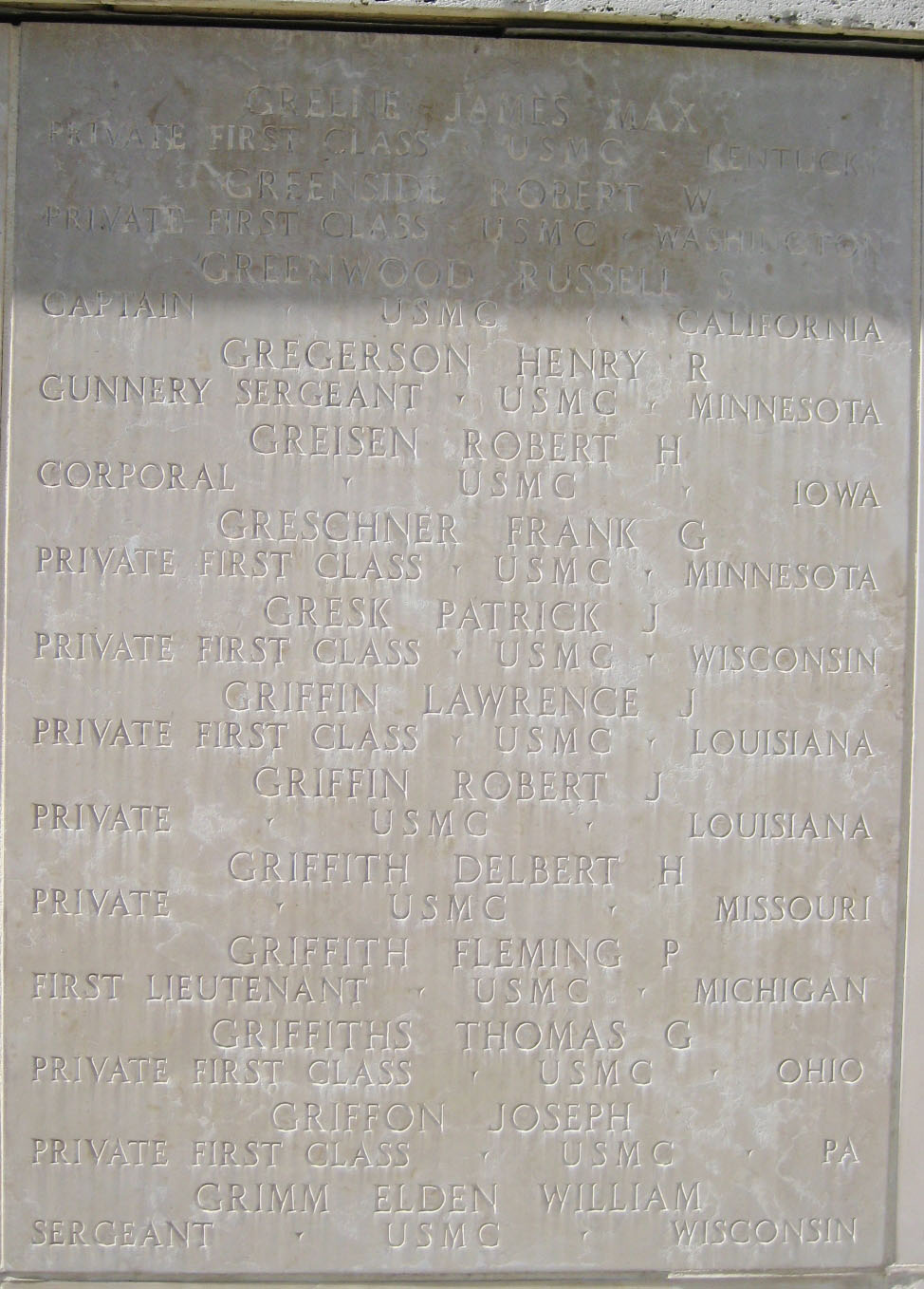 Frank George Greschner was born on October 24, 1923, in Saint Paul, Ramsey County, Minnesota. He served in Company A, 1st Battalion, 3rd Marine Regiment, 3rd Marine Division as a Private First Class during World War II. He died from his wounds received in battle on July 21, 1944, during the Battle for Guam.