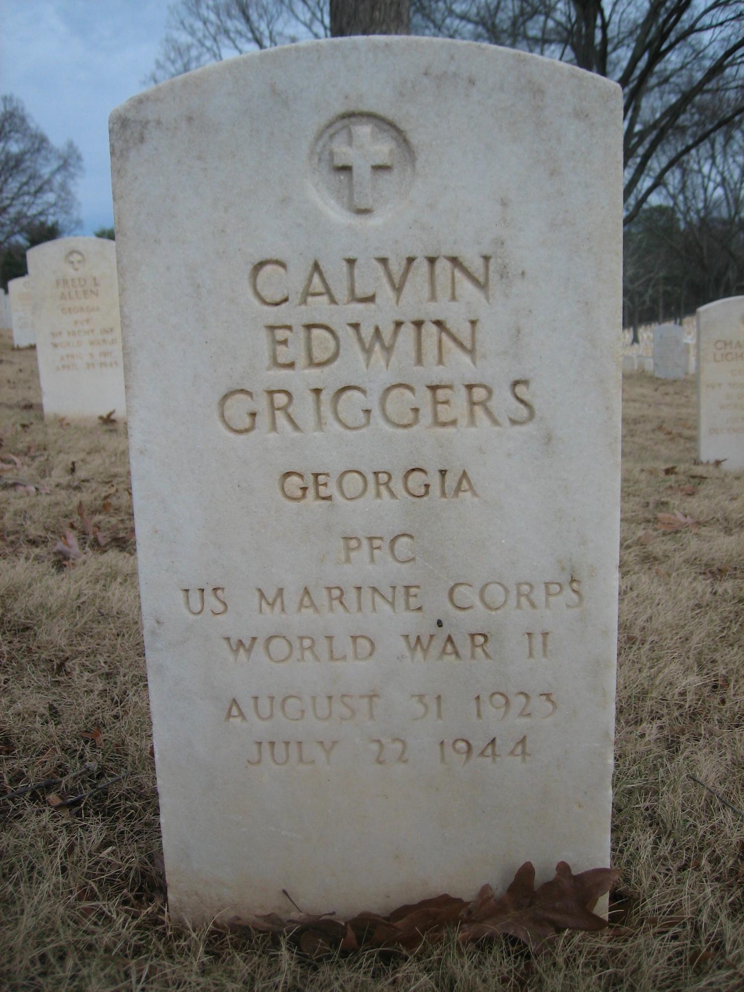 Calvin Edwin Griggers was born on August 31, 1923. He served in Company F, 2nd Battalion, 21st Marine Regiment, 3rd Marine Division as a Private First Class during World War II. He was Killed in Action on July 22, 1944, during the Battle for Guam.
