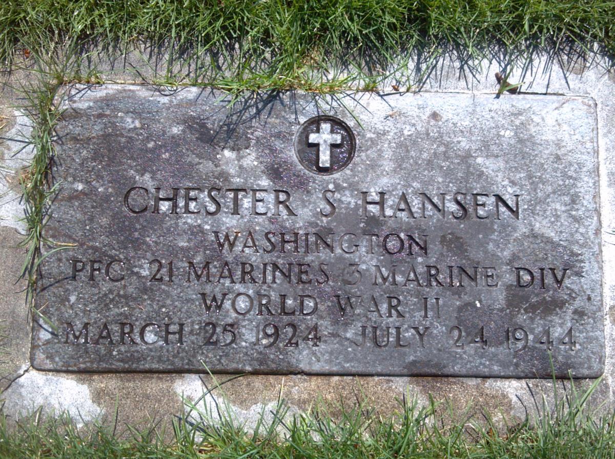 Chester Spencer Hansen was born on March 25, 1924, in Washington. He served in Company E, 2nd Battalion, 21st Marine Regiment, 3rd Marine Division as a Private First Class during World War II. He was Killed in Action on July 24, 1944, during the Battle for Guam.