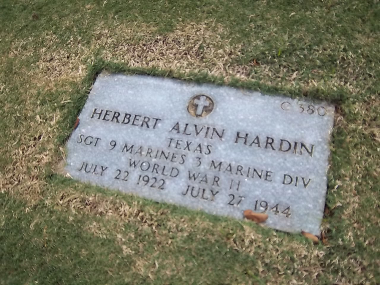 Herbert Alvin Hardin was born on July 22, 1922. He served in Company K, 3rd Battalion, 9th Marine Regiment, 3rd Marine Division as a Sergeant during World War II. He was Killed in Action on July 27, 1944, during the Battle for Guam.