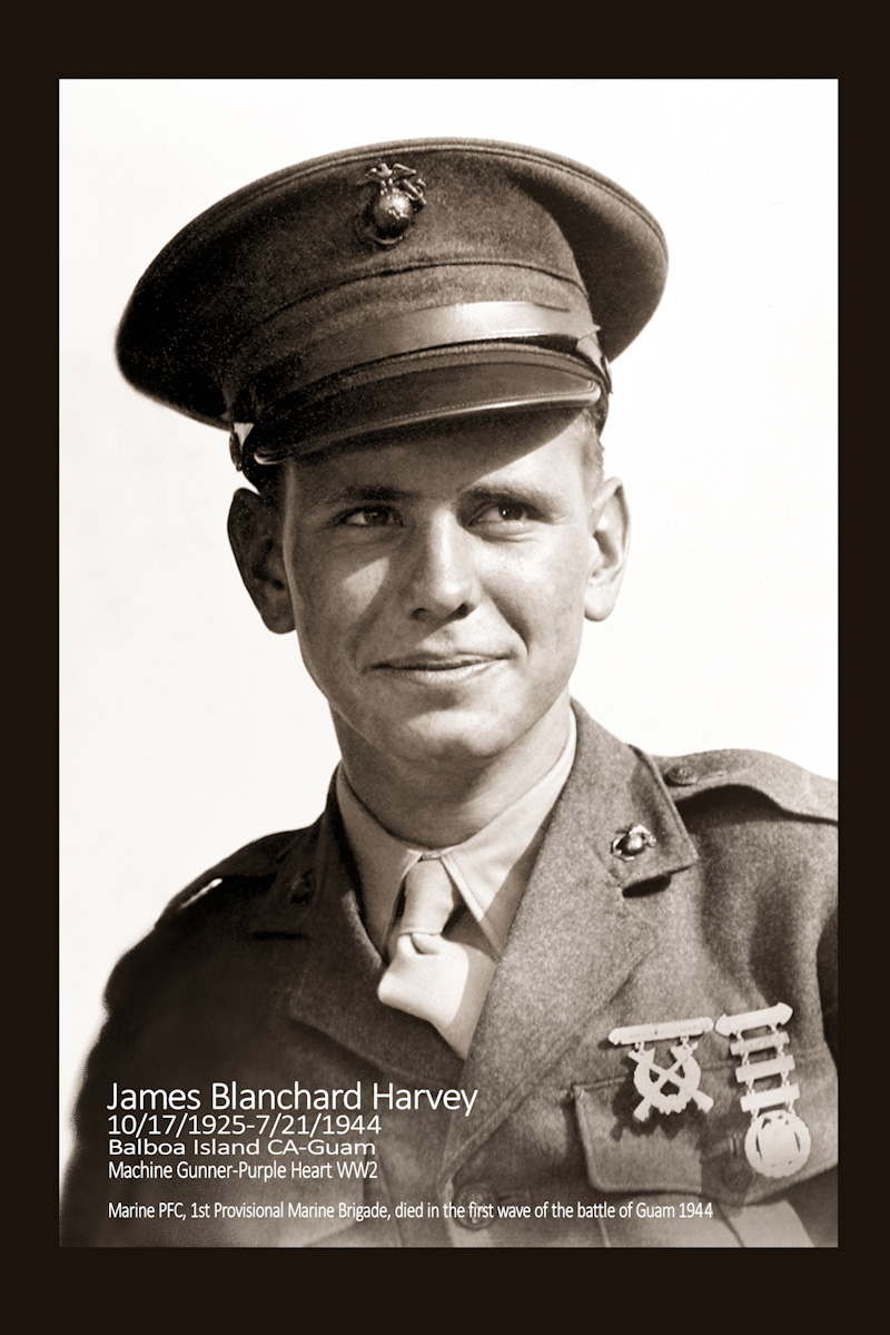 James Blanchard Harvey was born on October 17, 1925, in Los Angeles, Los Angeles County, California. He served in Company K, 3rd Battalion, 4th Marine Regiment, 1st Provisional Marine Brigade as a Private First Class during World War II. He was Killed in Action on July 21, 1944, during the Battle for Guam.