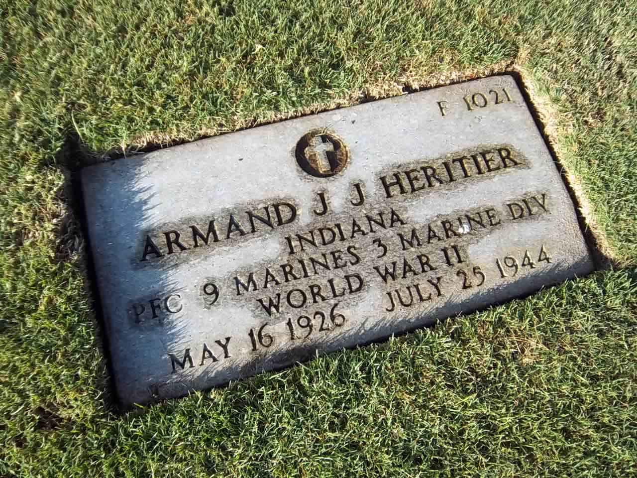 Armand Joe James Heritier was born on May 16, 1926. He served in Company E, 2nd Battalion, 9th Marine Regiment, 3rd Marine Division as a Private First Class during World War II. He was Killed in Action on July 25, 1944, during the Battle for Guam.
