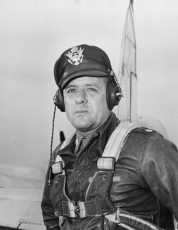 Born on July 22, 1911 in Webster City, Iowa. During World War II, Colonel Marion Malcolm commanded the 52nd Fighter Group, equipped with P-51 Mustangs, in Italy from August 1944 until the end of the war. He received credit for shooting down a German Messerschmitt Bf 109 on April 16, 1945, during a fighter sweep into Bavaria and Austria. He was awarded the Distinguished Flying Cross with Oak Leaf Cluster and Air Medal with four Oak Leaf Clusters.