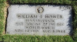 William T. Hower was born on November 14, 1910. He was the son of David C. Hower and Blanche Jennie Groce Hower. He served in the 306th Infantry Regiment, 77th Division as a Private during World War II. He died on August 8, 1944, during the Battle for Guam.
