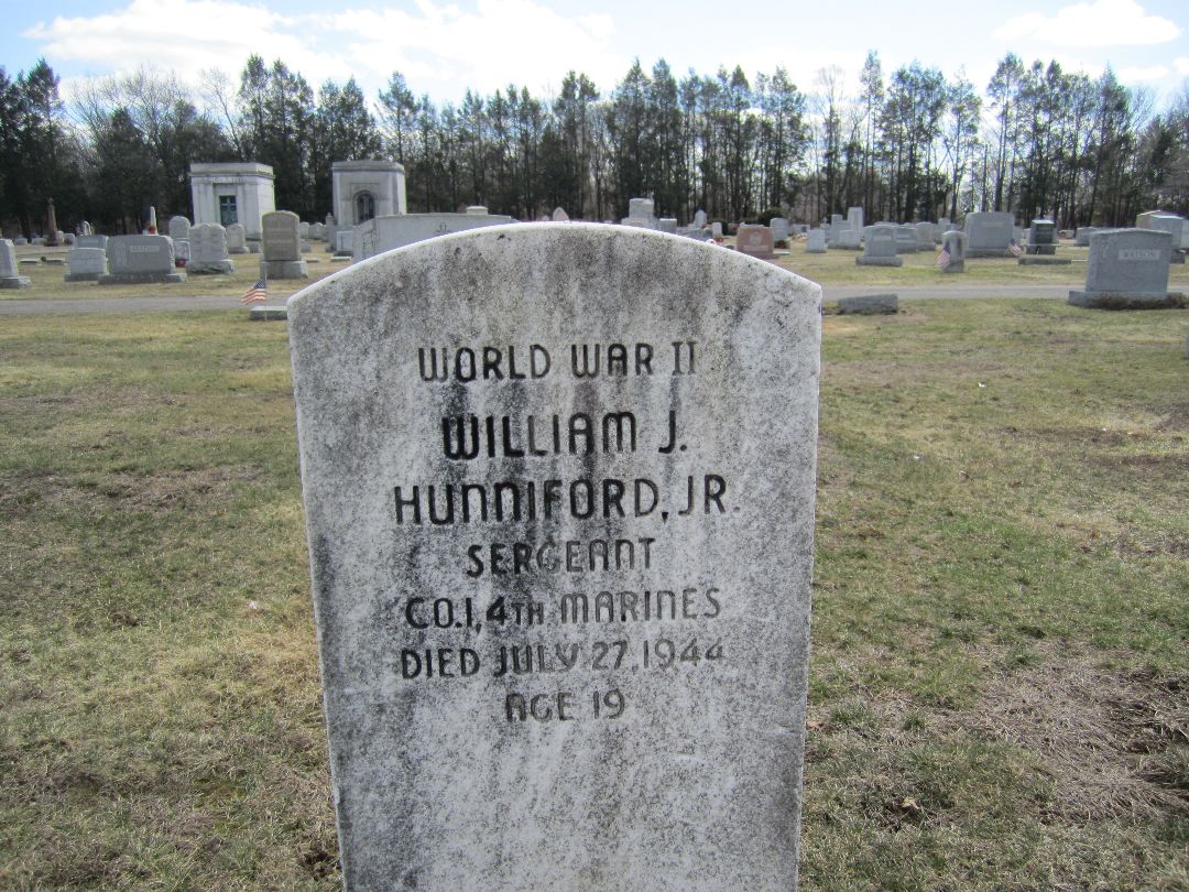 William John Hunniford Jr. was born in Rockville, Tolland County, Connecticut. He served in Company I, 3rd Battalion, 4th Marine Regiment, 1st Provisional Marine Brigade as a Sergeant. He was Killed in Action on July 27, 1944, during the Battle for Guam.