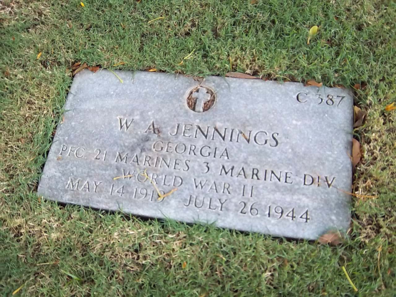 W. A. Jennings was born on May 14, 1919. He served in Company I, 3rd Battalion, 21st Marine Regiment, 3rd Marine Division as a Private First Class during World War II. He was Killed in Action on July 26, 1944, during the Battle for Guam.