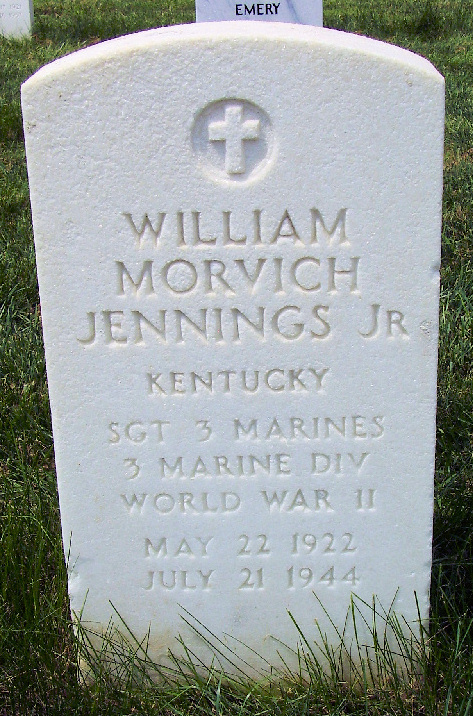 William Morvich Jennings Jr. was born on May 22, 1922. He served in Company K, 3rd Battalion, 3rd Marine Regiment, 3rd Marine Division as a Sergeant during World War II. He was Killed in Action on July 21, 1944, during the Battle for Guam.