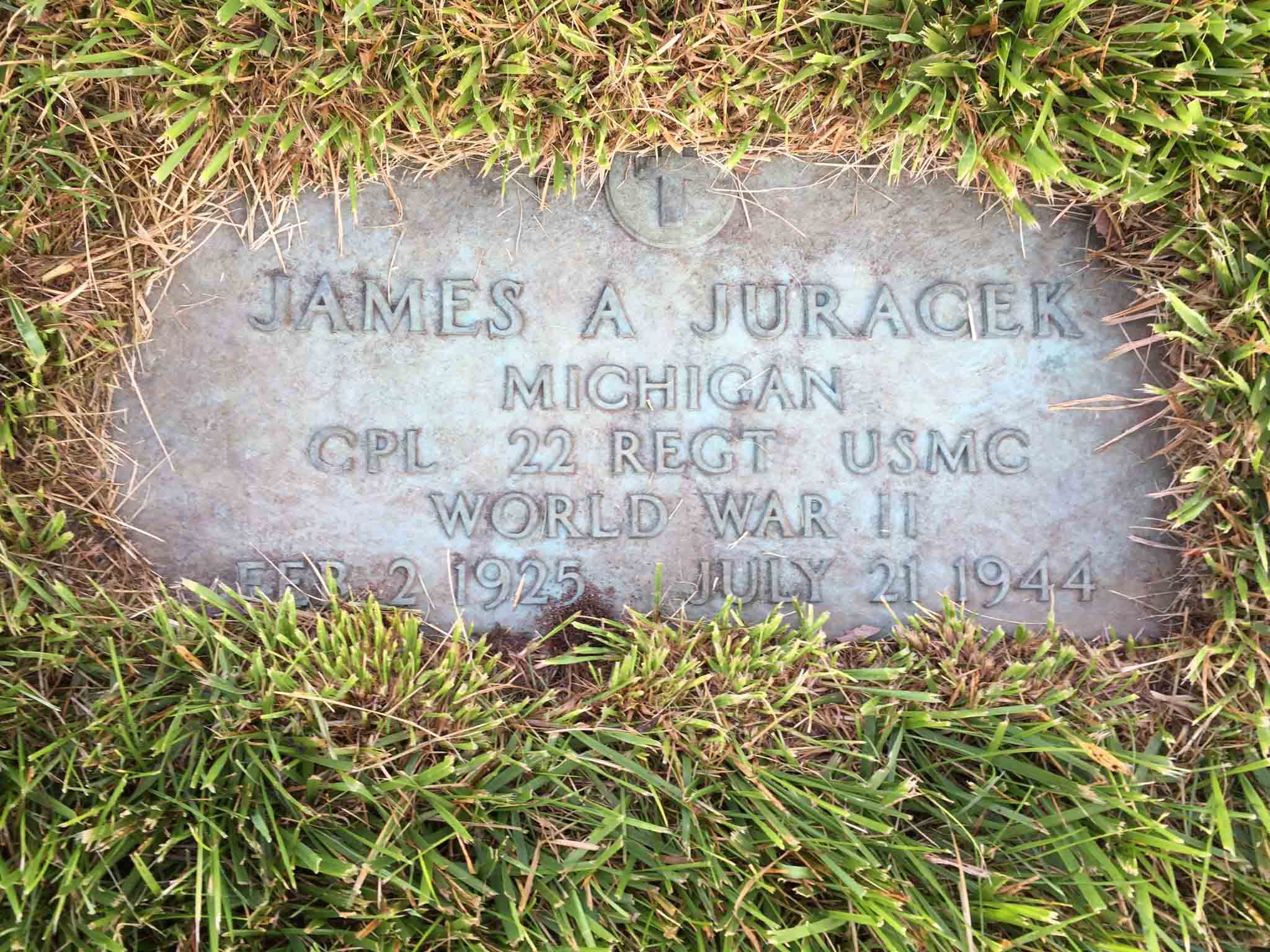James Anthony Juracek was born on February 2, 1925. He served in Company E, 2nd Battalion, 22nd Marine Regiment, 1st Provisional Marine Brigade as a Corporal during World War II. He died on July 21, 1944, during the Battle for Guam.