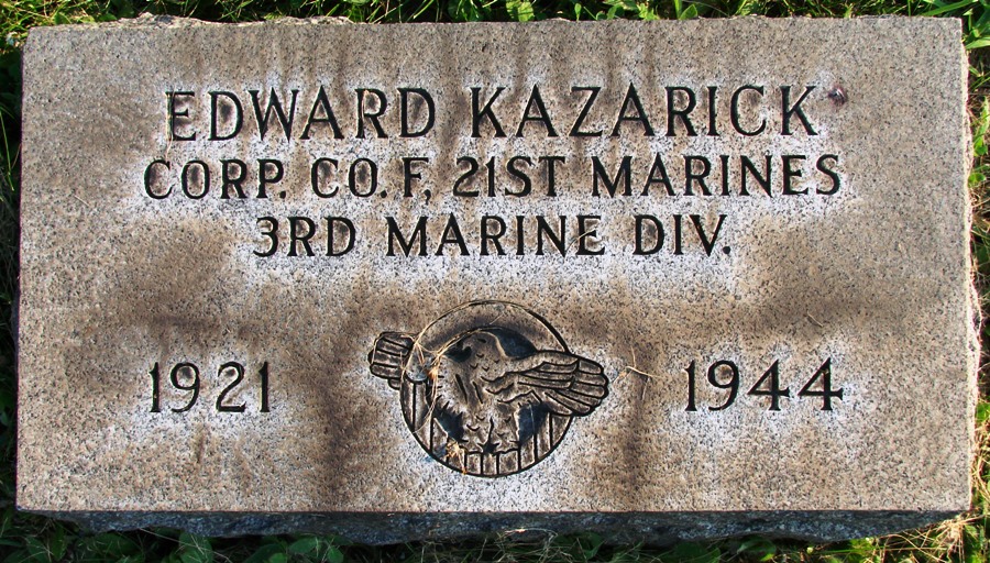 Edward Kazarick was born on December 28, 1921, in Washington, Washington County, Pennsylvania. He served in Company I, 3rd Battalion, 21st Marine Regiment, 3rd Marine Division as a Corporal during World War II. He was Killed in Action on July 22, 1944, during the Battle for Guam.