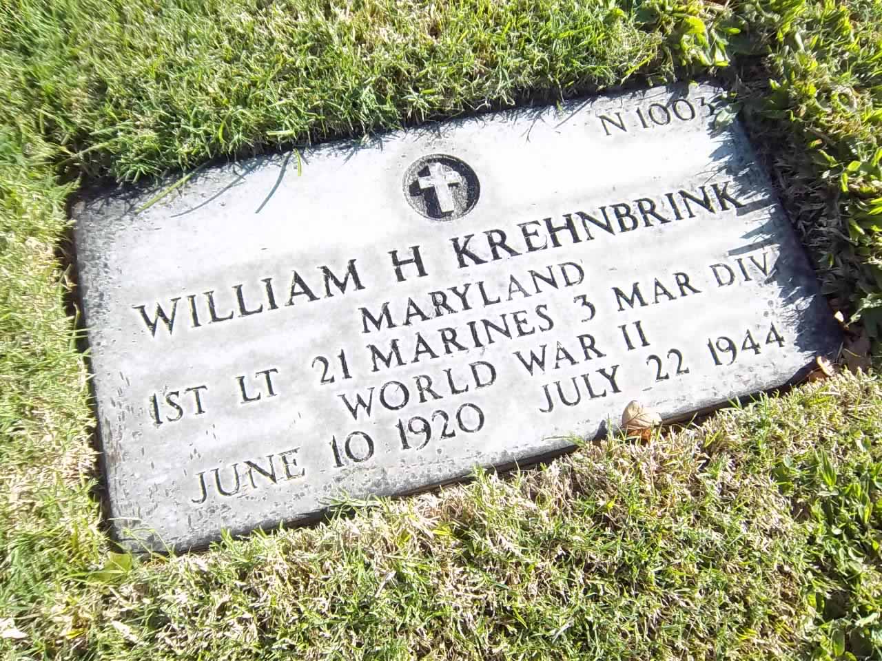 William Hubert Krehnbrink was born on June 10, 1920, in Maryland. He served in Company C, 1st Battalion, 21st Marine Regiment, 3rd Marine Division as a First Lieutenant during World War II. He was Killed in Action on July 22, 1944, during the Battle for Guam.