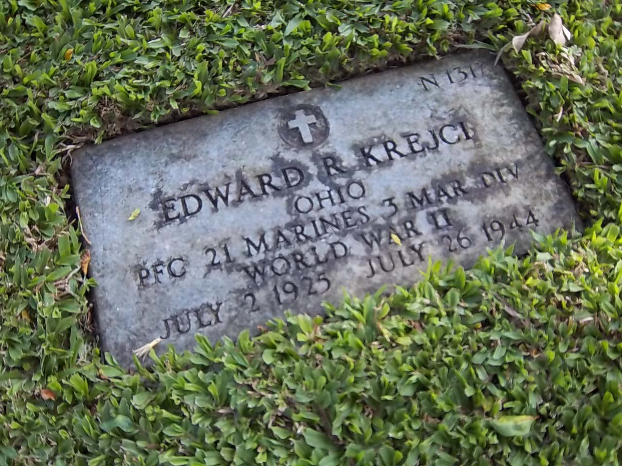 Edward Raymond Krejci was born on July 2, 1925. He served in Company B, 1st Battalion, 21st Marine Regiment, 3rd Marine Division as a Private First Class during World War II. He was Killed in Action on July 26, 1944, during the Battle for Guam.