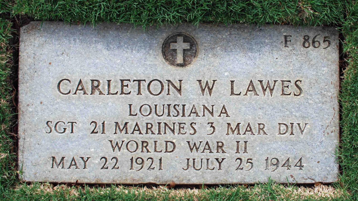 The President of the United States of America takes pride in presenting the Silver Star (Posthumously) to Sergeant Carleton W. Lawes (MCSN: 283399), United States Marine Corps Reserve, for conspicuous gallantry and intrepidity while serving with the First Battalion, Twenty-First Marines, THIRD Marine Division, in action against enemy Japanese forces on the Asan-Adelup Beachhead, Guam, Marianas Islands, on 25 July 1944. When his platoon was suddenly pinned down by a withering barrage of enemy machine-gun fire on an exposed ridge, Sergeant Lawes unhesitatingly placed himself in the lead and encouraged his companions to continue the assault. Determined to reach his objective, he gallantly led his men forward but, upon reaching the Japanese position, was struck down by the enemy. By his daring initiative, indomitable fighting spirit and fearless disregard of personal safety, Sergeant Lawes enabled his platoon to continue the assault, and his valiant devotion to duty throughout was in keeping with the highest traditions of the United States Naval Service.He gallantly gave his life for his country.