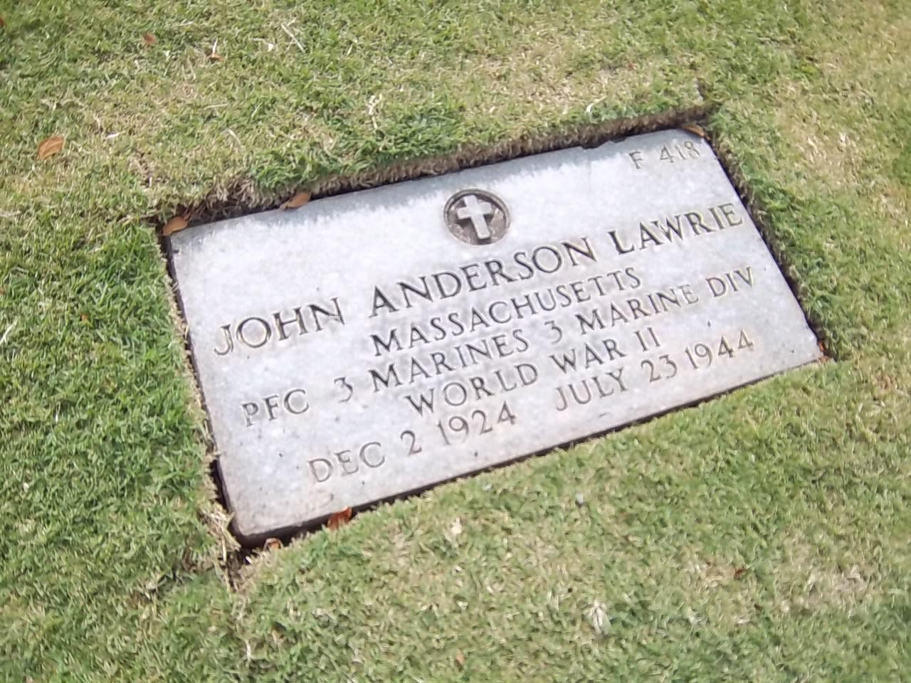 John Anderson Lawrie was born on December 2, 1924. He served in Company B, 1st Battalion, 3rd Marine Regiment, 3rd Marine Division as a Private First Class during World War II. He was Killed in Action on July 23, 1944, during the Battle for Guam.