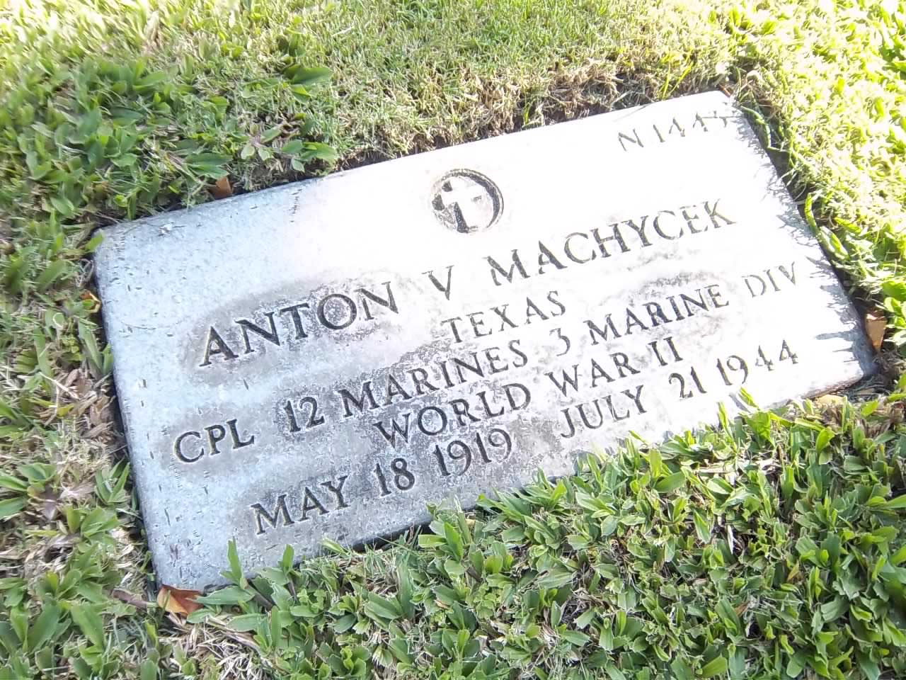 Anton Victor Machycek was born on May 18, 1919. He served in the Headquarters and Service Battery, 3rd Battalion, 12th Marine Regiment, 3rd Marine Division as a Corporal during World War II. He was Killed in Action on July 21, 1944, during the Battle for Guam.