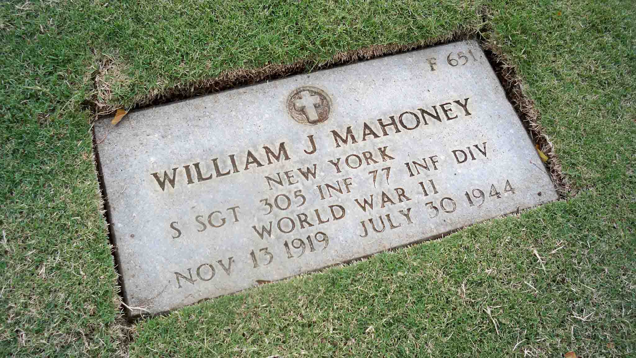 William J. Mahoney was born on November 13, 1919. He served in the 305th Infantry Regiment, 77th Division as a Staff Sergeant during World War II. He died on July 30, 1944, during the Battle for Guam.