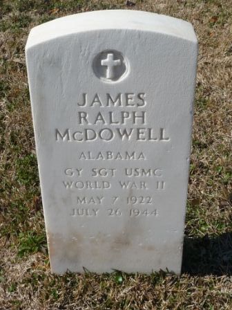 James Ralph McDowell was born on May 7, 1922. He served in Company A, 1st Battalion, 21st Marine Regiment, 3rd Marine Division as a Gunnery Sergeant during World War II. He was Killed in Action on July 26, 1944, during the Battle for Guam.