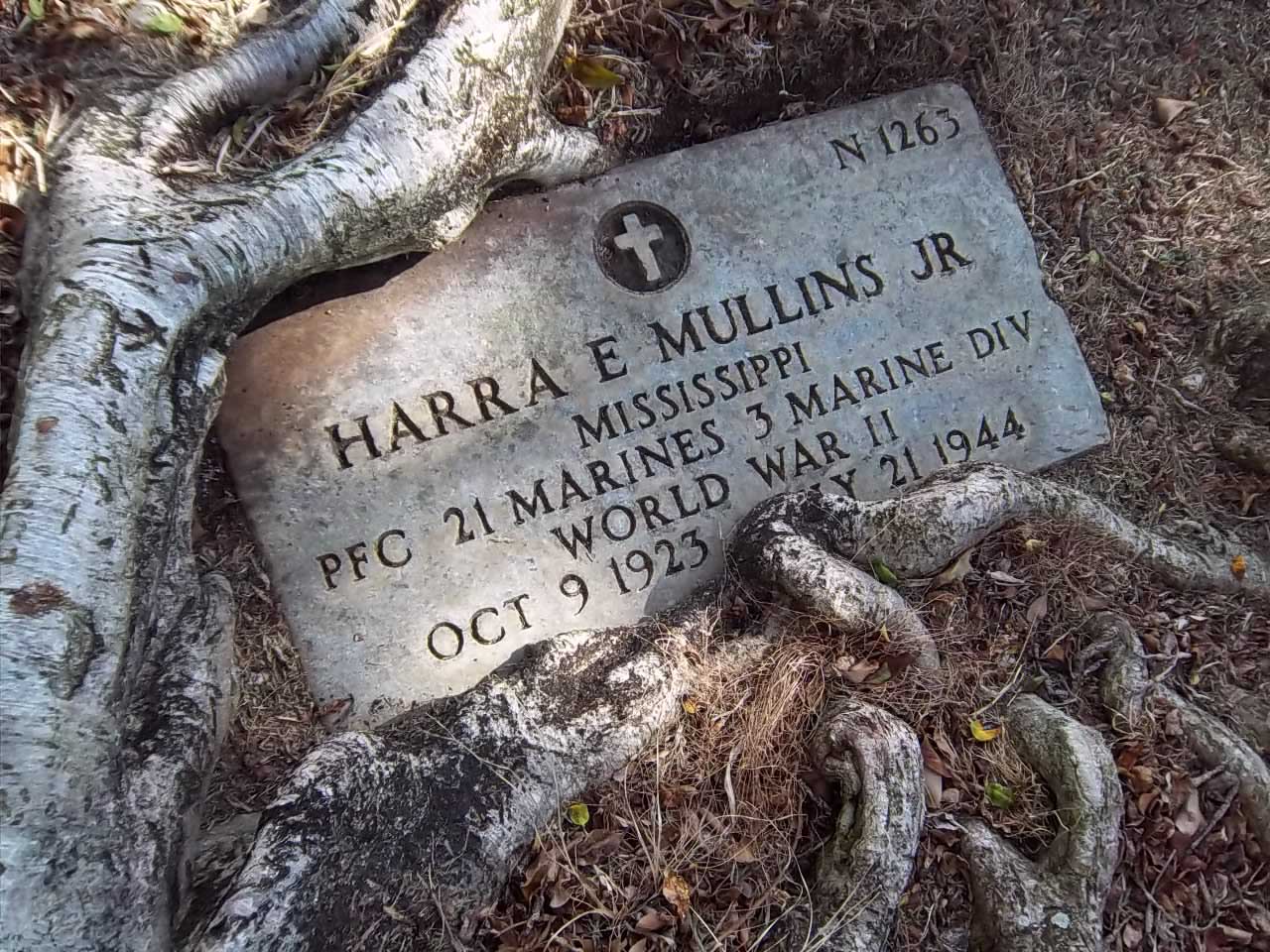 Harra Eugene Mullins Jr. was born on October 9, 1923. He served in Company A, 1st Battalion, 21st Marine Regiment, 3rd Marine Division as a Private First Class during World War II. He was Killed in Action on July 21, 1944, during the Battle for Guam.