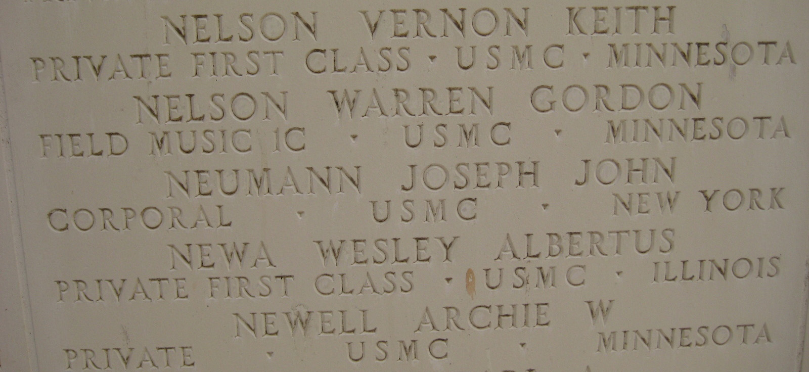 Vernon Keith Nelson was born on April 11, 1925, in Minneapolis, Hennepin County, Minnesota. He served in Company C, 4th Amphibian Tractor Battalion. United States Marine Corps as a Private First Class during World War II. He died from his wounds received in battle on July 25, 1944, during the Battle for Guam.