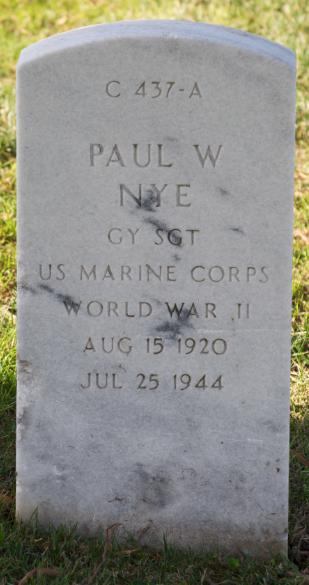 Paul Warren Nye was born on August 15, 1920. He served in Company B, 1st Battalion, 21st Marine Regiment, 3rd Marine Division as a Gunnery Sergeant during World War II. He died from his wounds received in battle on July 25, 1944, during the Battle for Guam.
