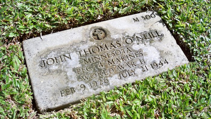 John Thomas O'Neill was born on February 9, 1926. He served in Company B, 1st Battalion, 4th Marine Regiment, 1st Provisional Marine Brigade as a Private First Class during World War II. He died on July 21, 1944, during the Battle for Guam.