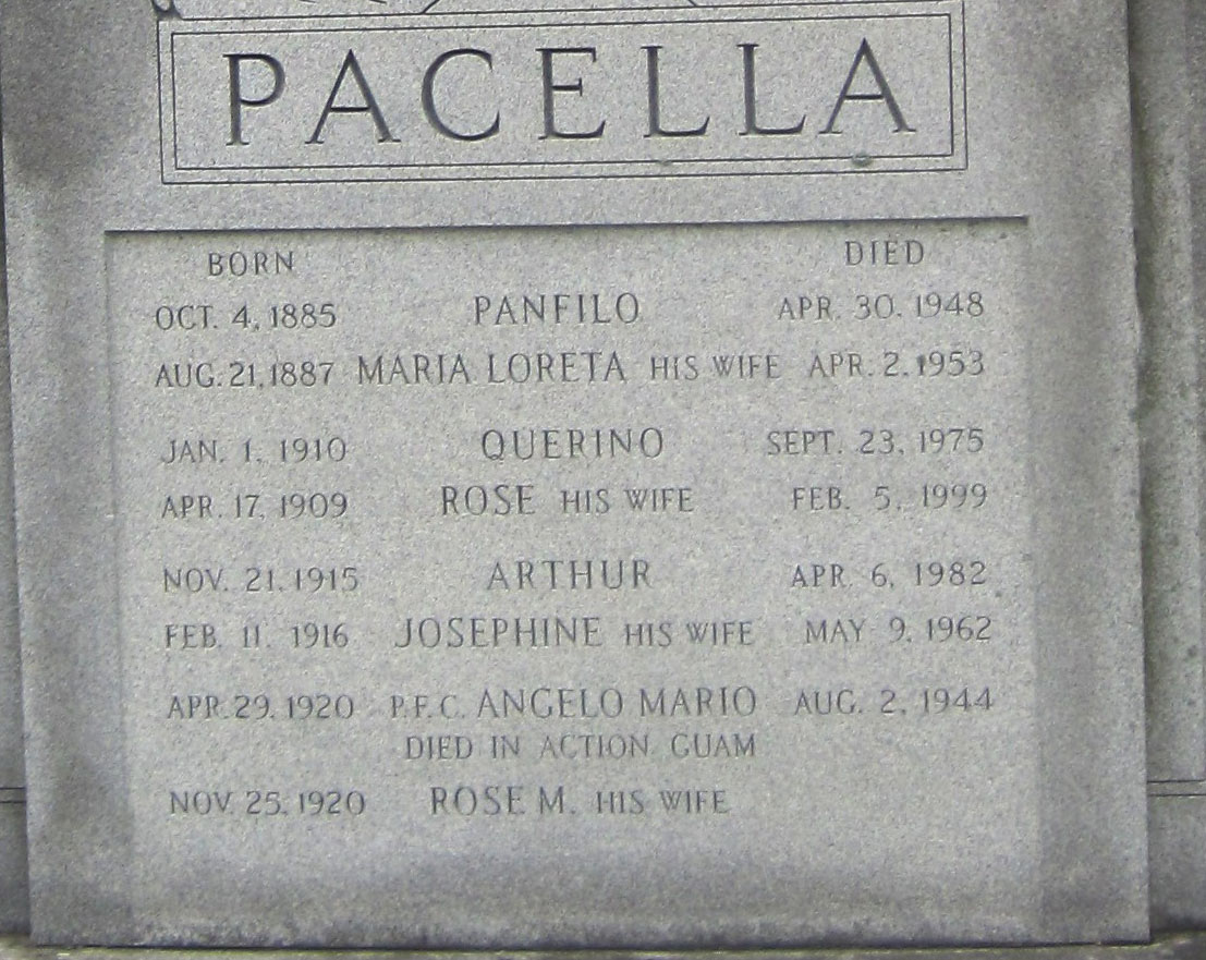 Angelo Mario Pacella was born on April 29, 1920, in Sulmona, Provincia di L'Aquila, Abruzzo, Italy. He served as a Private First Class during World War II. He died on August 2, 1944, during the Battle for Guam.