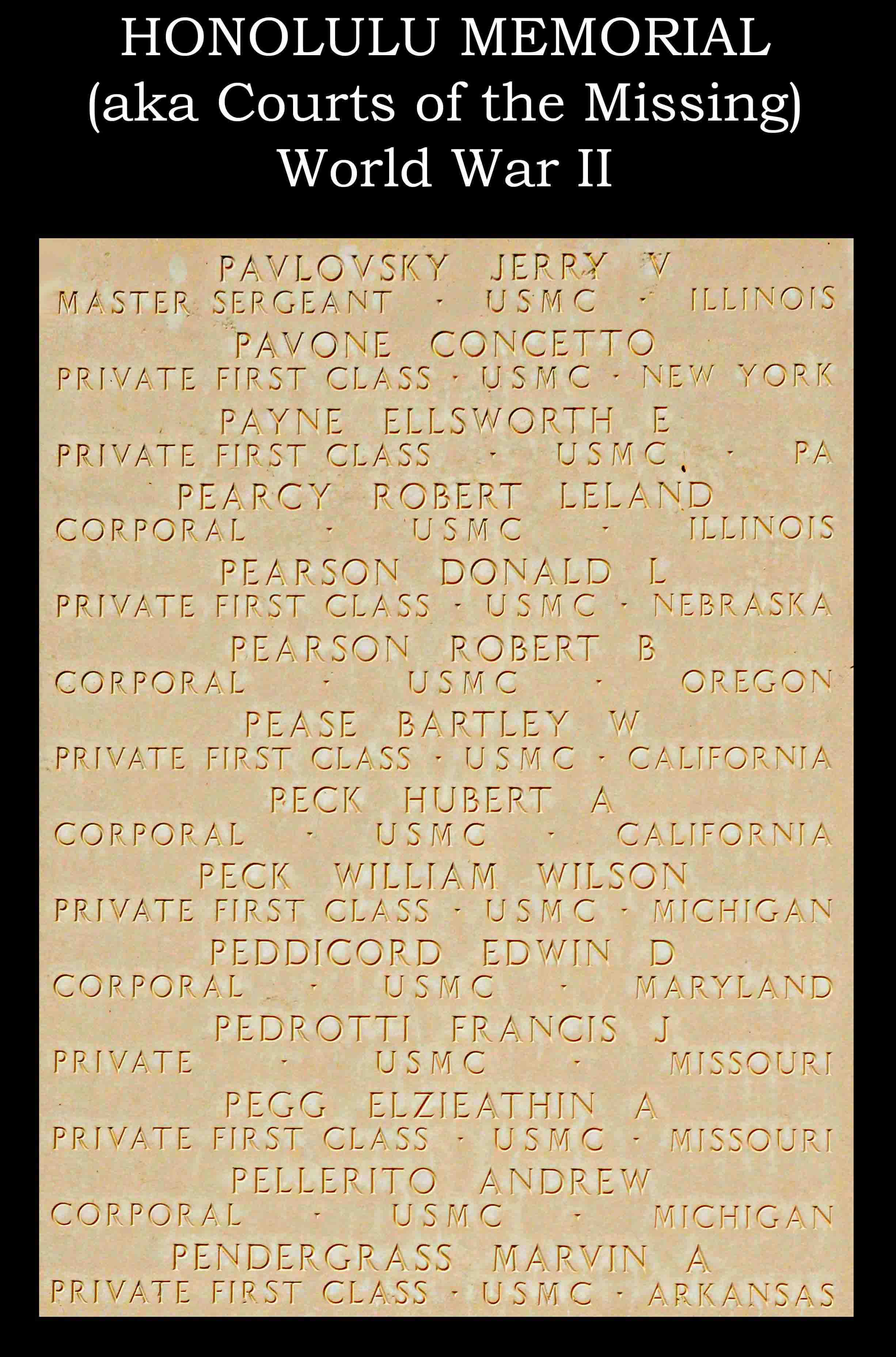 He served in Company E, 2nd Battalion, 3rd Marine Regiment, 3rd Marine Division as a Private First Class during World War II. He died from his wounds received in battle on July 24, 1944, during the Battle for Guam. He was buried at sea.