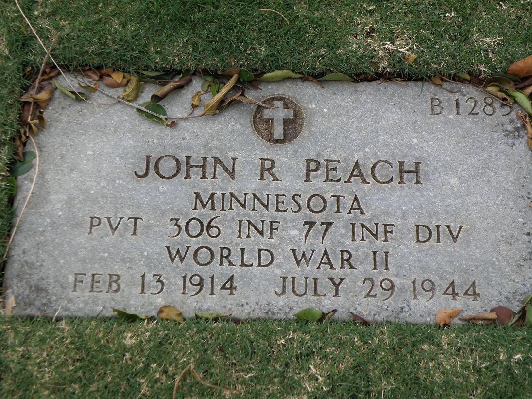 John Robert Peach was born on February 13, 1914. He was the husband of Hazel Alberta Nelson Peach. He served in the 306th Infantry Regiment, 77th Division as a Private First Class during World War II. He died on July 29, 1944, during the Battle for Guam.