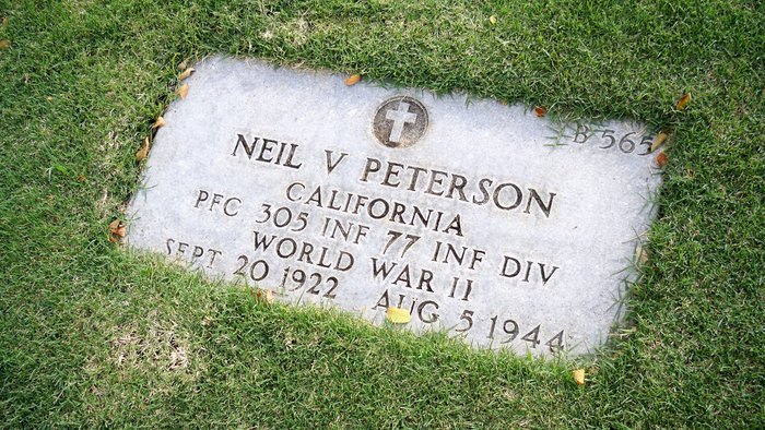 Neil V. Peterson was born on September 20, 1922. He served in the 305th Infantry Regiment, 77th Division as a Private First Class during World War II. He died on August 5, 1944, during the Battle for Guam.