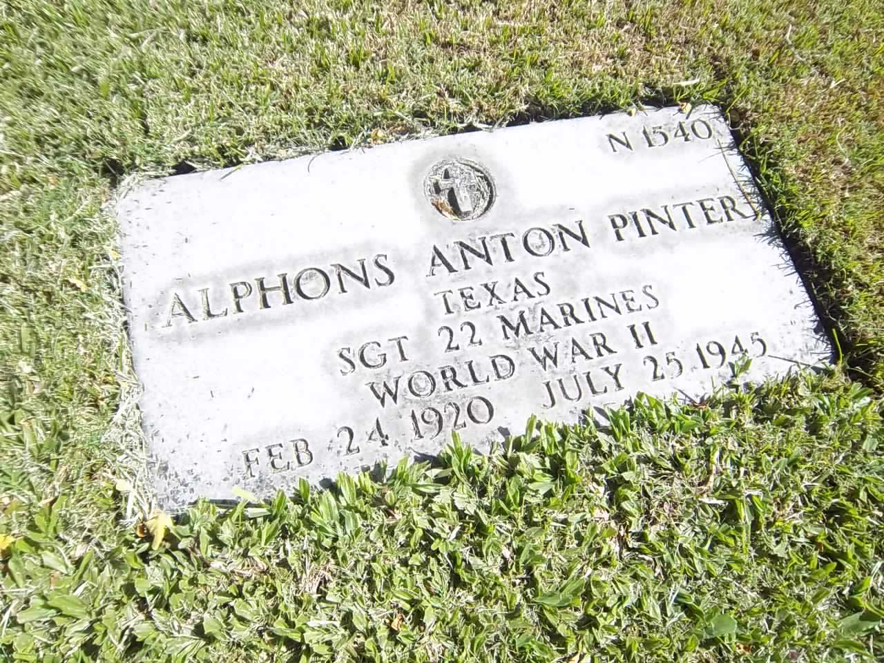 Alphons Anton Pinter was born on February 24, 1920, in Caldwell, Burleson County, Texas. He served in Company G, 2nd Battalion, 22nd Marine Regiment, 1st Provisional Marine Brigade as a Sergeant during World War II. He was Killed in Action on July 25, 1945, during the Battle for Guam.
