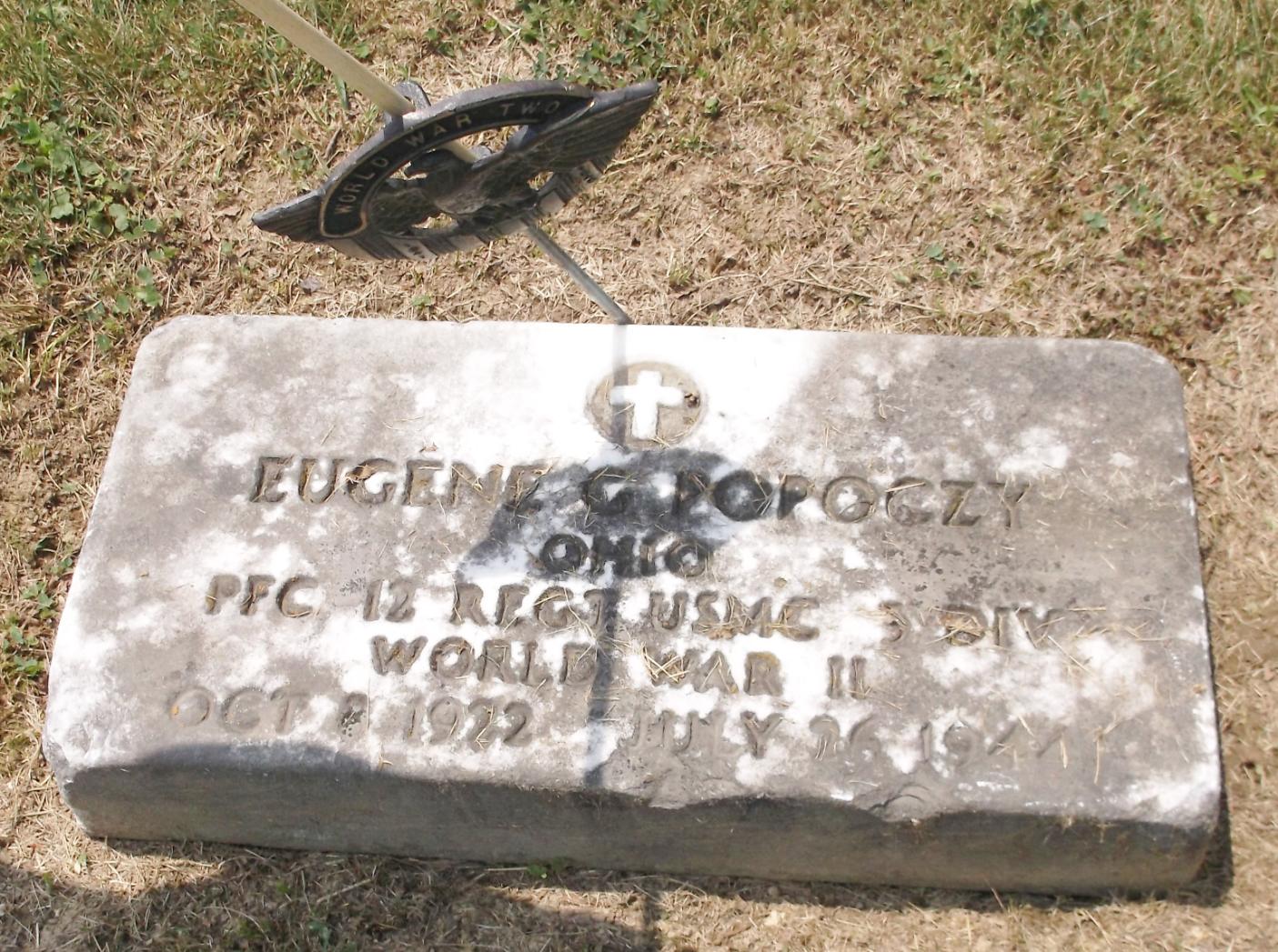 Eugene Gregory Popoczy was born on October 8, 1922, in Hocking County, Ohio. He served in the Headquarters and Service Battery, 2nd Battalion, 12th Marine Regiment, 3rd Marine Division as a Private First Class during World War II. He was Killed in Action on July 26, 1944, during the Battle for Guam.