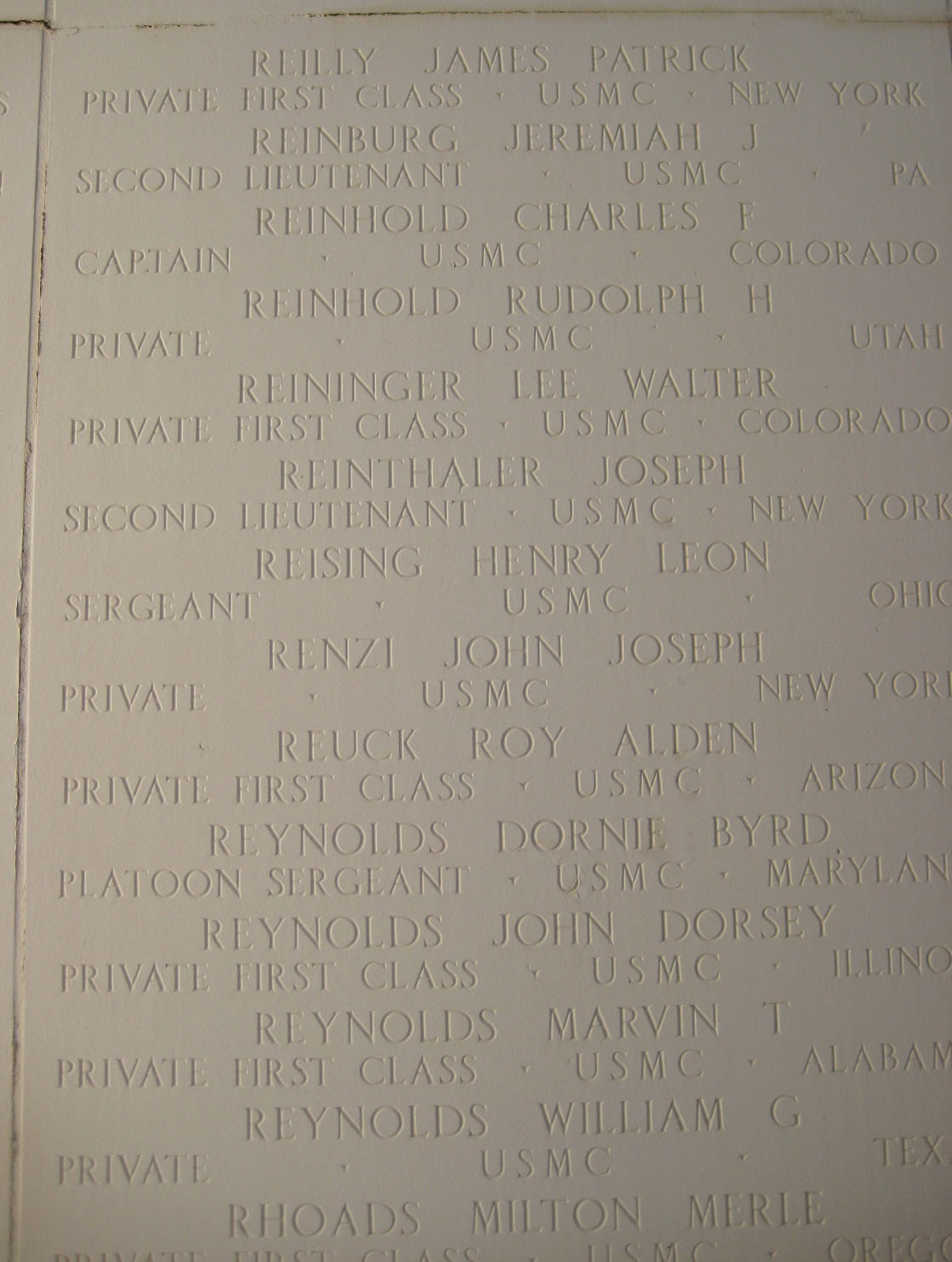 Joseph Reinthaler was born on December 19, 1920, in Queens, Queens County, New York. He served in Company E, 2nd Battalion, 3rd Marine Regiment, 3rd Marine Division as a Second Lieutenant during World War II. He was declared Missing in Action on July 25, 1944, during the Battle for Guam.