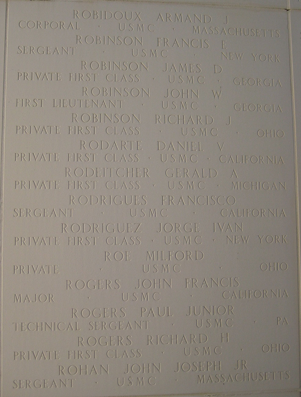 Gerald Andrew Rodeitcher served in Company E, 2nd Battalion, 4th Marine Regiment, 1st Provisional Marine Brigade as a Private First Class during World War II. He died from his wounds received in battle on July 31, 1944, during the Battle for Guam. He was buried at sea.